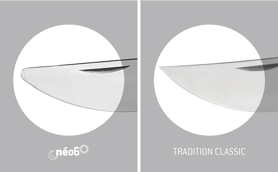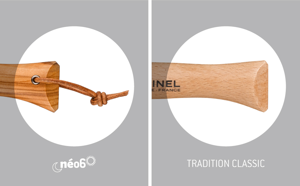 neo6の刃には、硬度55-57HRCのヨーロッパ産ステンレススチールを採用しています。従来のオピネルナイフと比べて、より安全にお使いいただけるよう刃先がやや丸みを帯びているのが特徴です。