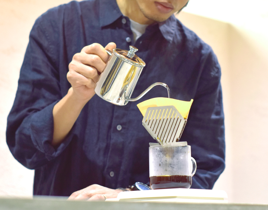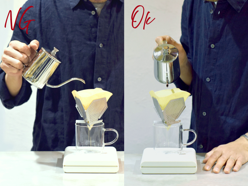 実は、くぼみを作るコツは「姿勢」にもあります。脇を締めて半身になり、ポットを縦に構えると、驚くほどドリップが安定します。見た目もどこかプロっぽく、気分はすっかりバリスタ。お湯が少なくなると蓋が外れやすいポットは、思い切って外してもOKです。ただし勢いが強くなるので注意を。ミニドリップポットなら、細いノズルで安定した注湯ができ、蓋を付けたままでも安心です。
